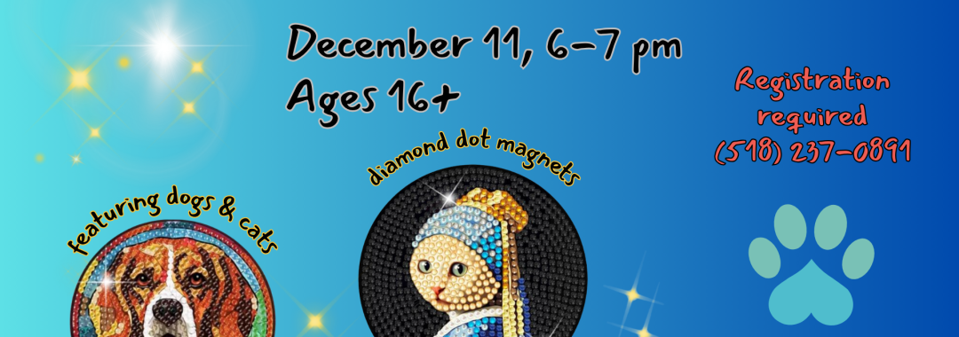 We’ll be crafting charming diamond-painted magnets featuring cats and dogs. Participants can relax as they place the faceted gems piece by piece, bringing each cute design to life. This is a great hands-on meditative craft and a fun way to create something bright for your fridge. Registration required. Open to ages 16+